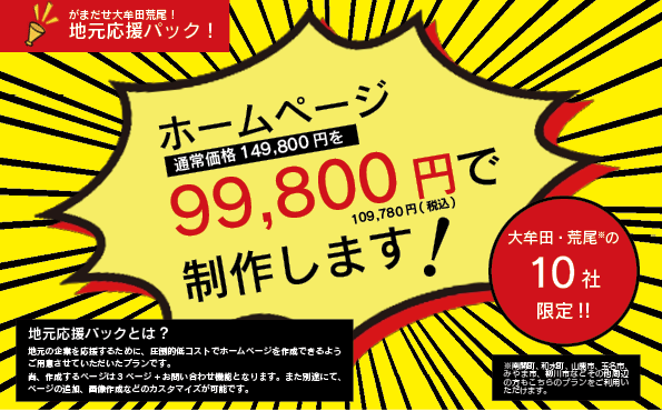 <<大牟田荒尾周辺地域の10社限定!!地元応援パックでホームページを99,800円で制作いたします!!>>